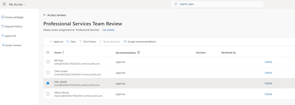 In this example, this was the same result for all 4 members of the group. Chris Hoard, Bill Wye, Mar Llambi and Marco Rocca were all recommended to keep access based on High Affiliation with the group.