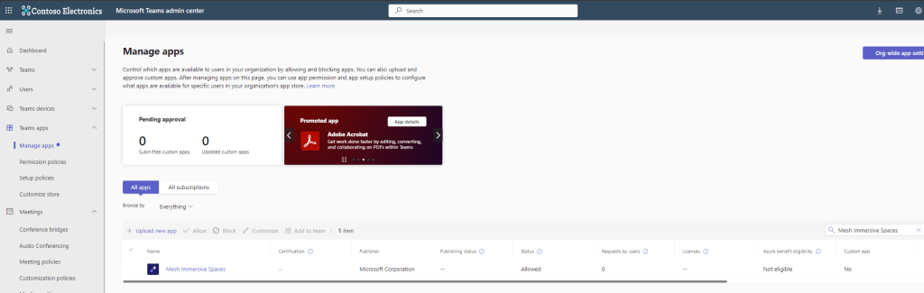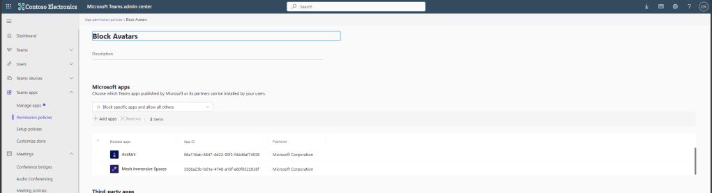 6.) As with any app in Teams, you can disable the Mesh Immersive Spaces app if you don’t want the org to use it, or if you don’t want specific users to have access to the app, or only want specific users to use the app, you can configure App Permission Policies,