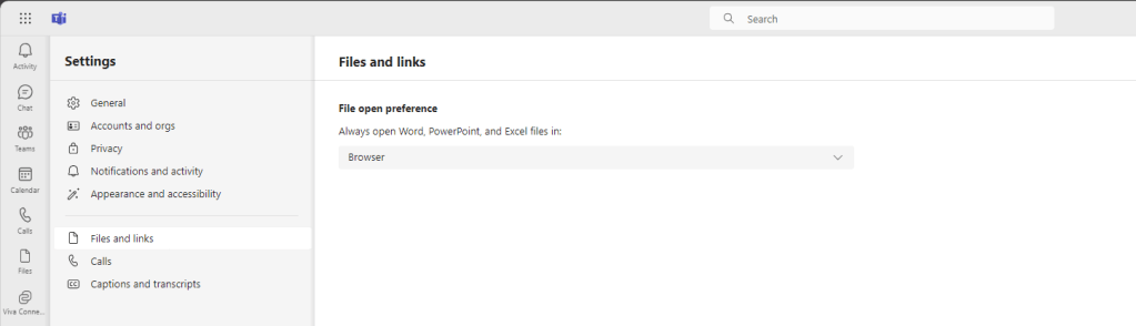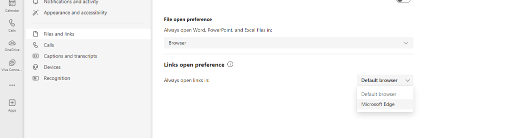 Let us take the scenario regarding the partner, they want links in Teams to open as Tabs in Chrome as opposed to Edge when they click on a link in the Teams desktop client. By default, this setting is set to use Microsoft Edge.